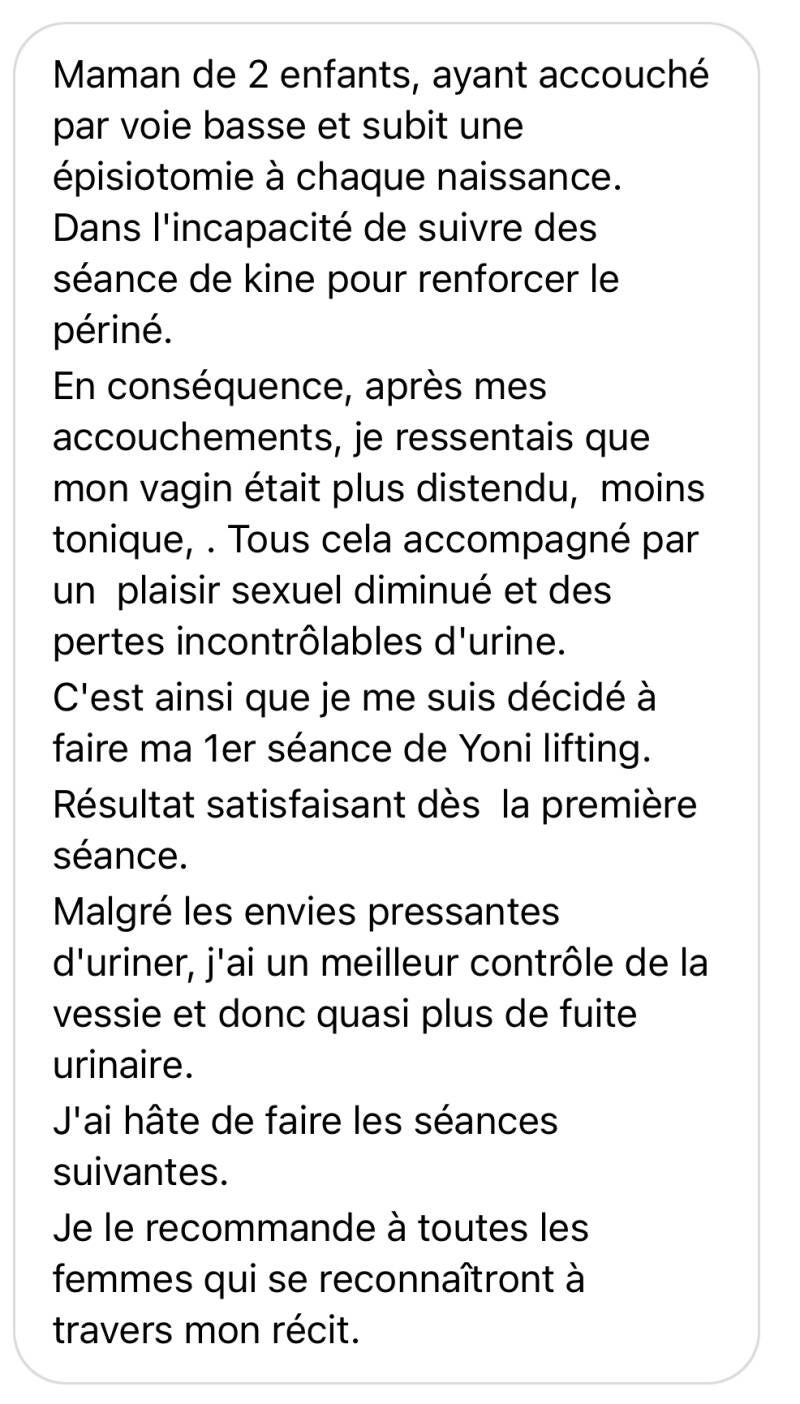 - l ’accouchement implique de nombreux changements physiologiques au corps d’une femme. Après l’accouchement, les parois vaginales peuvent être distendues et sèches ; le plancher pelvien peut être affaibli. Après la kinésithérapie pelvienne qui sera conseillée en première ligne, le Yoni lifting apporte une solution innovante en restaurant le tonus et l’élasticité des parois vaginales.